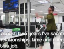 « Il est 4h30 du matin et je suis au travail. Je travaille pour une super entreprise qui produit des vidéos d’actualité. Pendant près de deux ans, j’ai sacrifié ma vie personnelle, mon temps et mon énergie pour cet emploi. Et tout ce qui intéresse mon patron c’est… la quantité de vidéos qu’on produit et leur nombre de vues. Alors je me suis dit que j’allais faire MA propre vidéo pour me concentrer sur le contenu plutôt que sur les vues. Et faire savoir à mon patron que… je démissionne! Je suis partie, » peut-on lire en sous-titre.