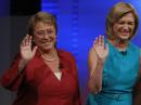 Michelle Bachelet et Evelyn Matthei, qui s’affrontent dimanche 17 novembre 2013 dans les urnes, lors d’un débat télévisé à Santiago, le 29 octobre. REUTERS/Ivan Alvarado