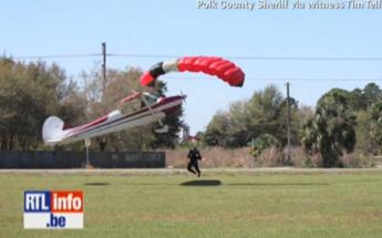 Images surréalistes en provenance des États-Unis. Des photos ont été prises à Mulberry en Floride. Un parachutiste vient se poser dans l’axe de la piste quand un « Cessna » décolle. Il n’avait sans doute pas vu le parachutiste arriver et l’a accroché avec son aile droite. L’homme a été projeté à plus de 8 mètres de haut avant de retomber au sol. Le « Cessna » lui s’est écrasé au sol. Par miracle ni le pilote ni le parachutiste ne sont sérieusement blessés.