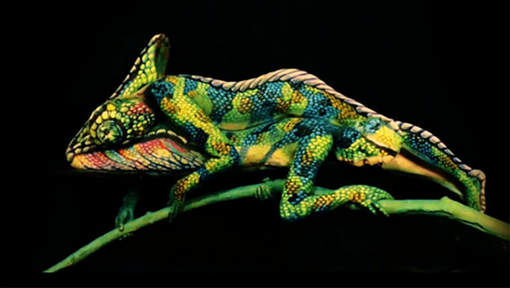 L’artiste a transformé deux femmes en… caméléon! Car oui, l’animal est en réalité composé de deux êtres humains! Le maquillage de leur corps et leur position leur permettent de jouer la carte de l’illusion.