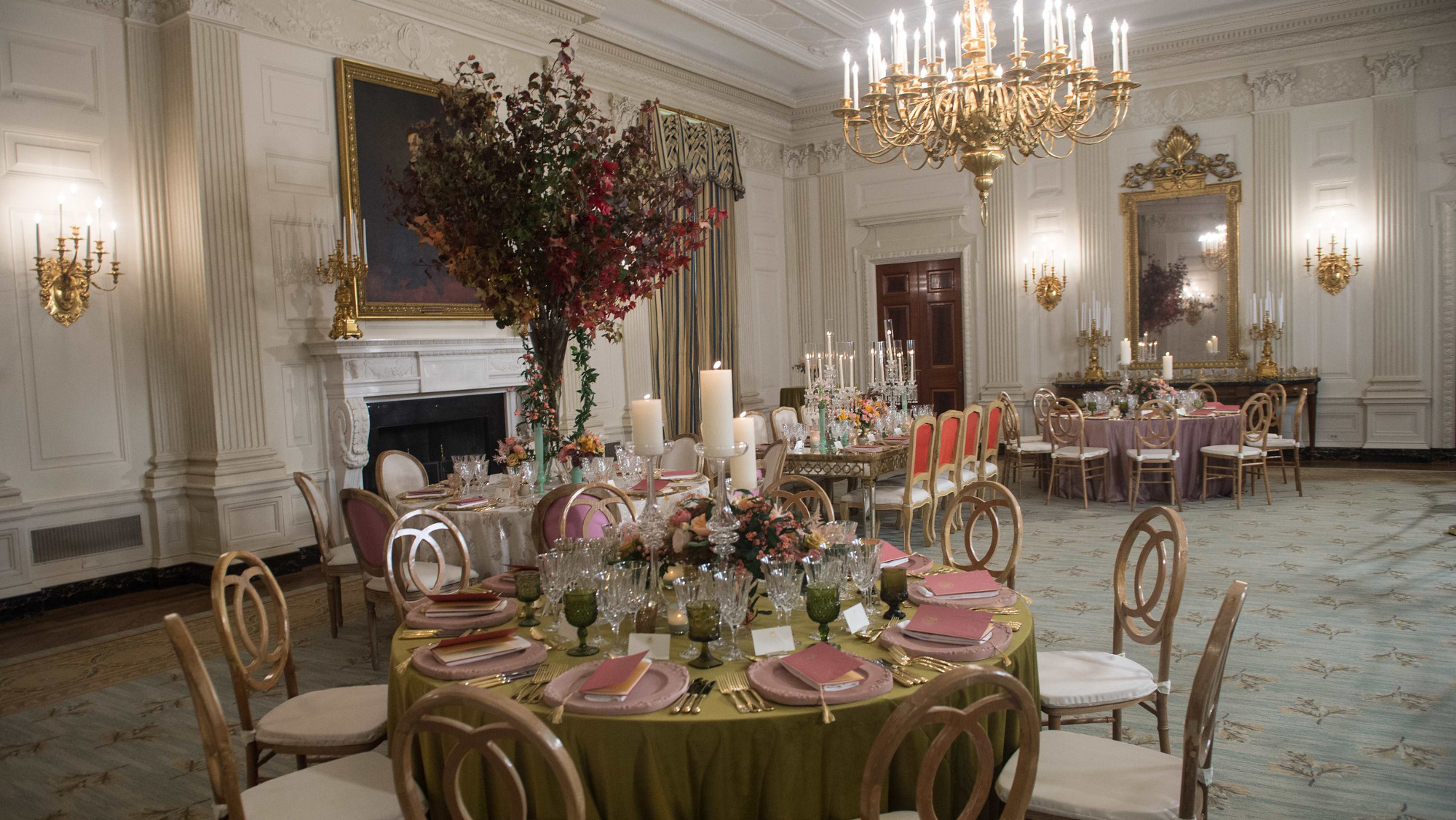 Encore un aperçu, côté rivière : les journalistes courent de l’autre côté de la demeure où une harpiste en costume d’époque égrène quelques notes sur la terrasse à colonnes qui surplombe le fleuve Potomac. Les quatre convives sortent quelques secondes admirer la vue puis rentrent dans le bâtiment, cette fois pour de bon.