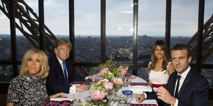 Brigitte Macron a troqué la robe rose de son arrivée pour un ensemble jaune paille qui contraste avec ses hauts talons aiguilles noirs. Melania arbore une cape noire sur robe noire, sur des stilettos Louboutin encore plus hauts, ongles vernis de blanc. Les deux hommes portent des costumes sombres, sage cravate gris foncé pour le plus jeune, une éclatante cravate bleu roi pour l’Américain.