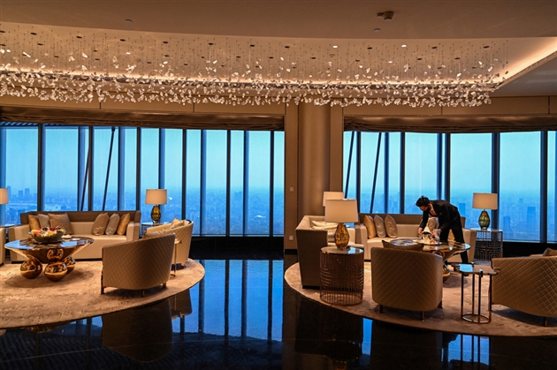 L’hôtel de luxe occupe ainsi le dernier des 128 étages de ce gratte-ciel, qui est le deuxième plus élevé de la planète après la Burj Khalifa (828 m) à Dubaï.