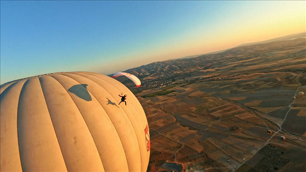 Dans le cadre de son projet Fairy Flight, Delluc a sauté d’une montgolfière à 2 600 m d’altitude et a effectué un vol extraordinaire entre cheminées de fées et montgolfières.