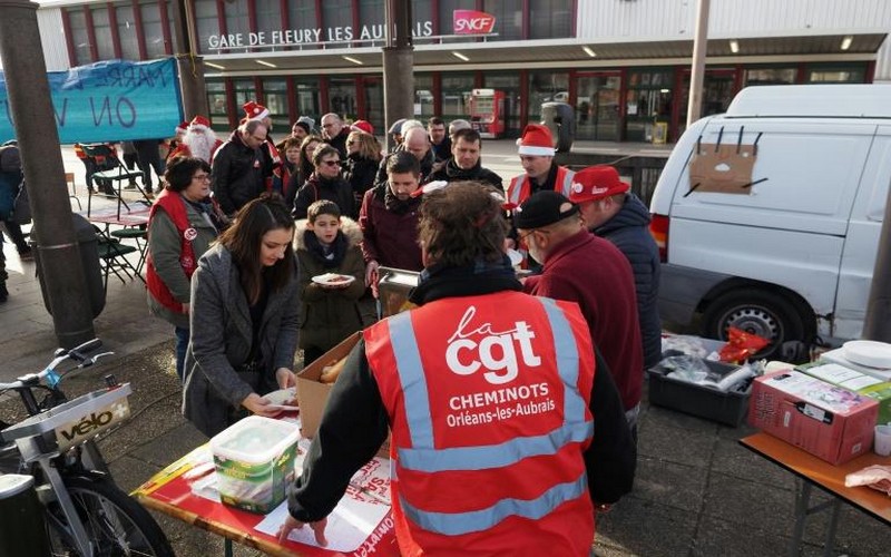 Dès lundi, des « banquets » de Noël ont ainsi été organisés, comme à la gare de Fleury-les-Aubrais (Loiret), où certains des quelque 80 cheminots grévistes présents s’étaient déguisés en père Noël. « On a organisé ça pour avoir un moment revendicatif et convivial », résumait Marion Gazeaux, de la CGT.